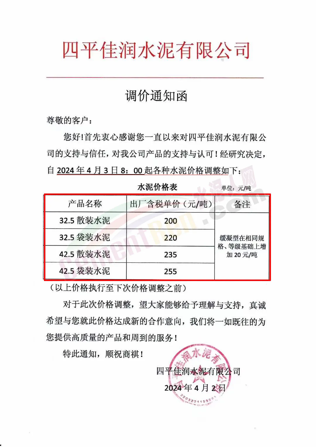 四平佳潤(rùn)水泥有限公司通知自2024年4月3日8:00起調(diào)整各品種水泥價(jià)格,價(jià)格上調(diào)后42.5散裝水泥執(zhí)行235元/噸。32.5包裝水泥執(zhí)行220元/噸。