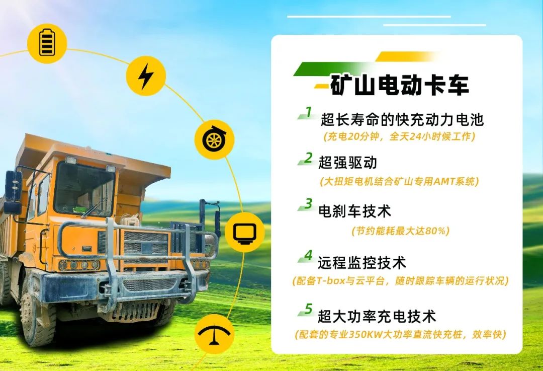 五、超大功率充電技術(shù)。配套的專業(yè)350KW大功率直流快充樁,確保礦車的運(yùn)營效率。