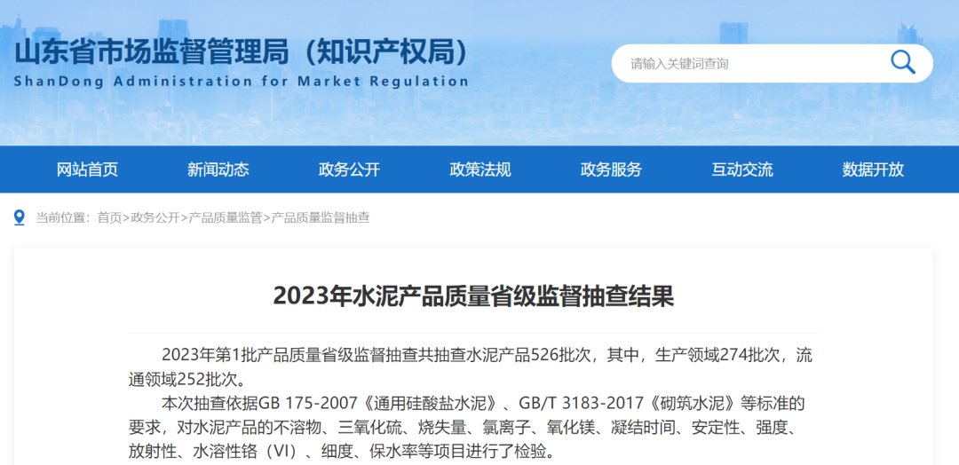 日前,山東省市場監(jiān)管局公布《2023年水泥產(chǎn)品質(zhì)量省級監(jiān)督抽查結果》稱,2023年第1批產(chǎn)品質(zhì)量省級監(jiān)督抽查共抽查水泥產(chǎn)品526批次,其中,生產(chǎn)領域274批次,流通領域252批次。