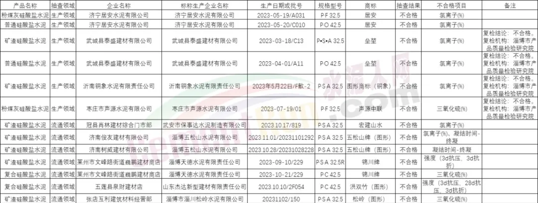 本次抽查發(fā)現(xiàn)濟寧居安水泥有限公司、武城縣泰盛建材有限公司、沂南銅象水泥有限責任公司、棗莊市聲源水泥有限公司等6家生產(chǎn)者生產(chǎn)的8批次產(chǎn)品,以及冠縣肖林建材綜合門市部、濟南俊友建材有限公司、濟南樹威建材有限公司、萊州市文峰路街道巍鵬建材商店、五蓮縣泉財建材店、張店互利建筑材料經(jīng)營部等6家銷售者銷售的7批次產(chǎn)品不符合相關標準的要求,不合格項目為三氧化硫、氯離子、水溶性鉻(Ⅵ)、凝結時間和強度。其中,武城縣泰盛建材有限公司、沂南銅象水泥有限責任公司、棗莊市聲源水泥有限公司對檢驗結果提出異議,并申請復檢;經(jīng)復檢后,維持初檢結論。