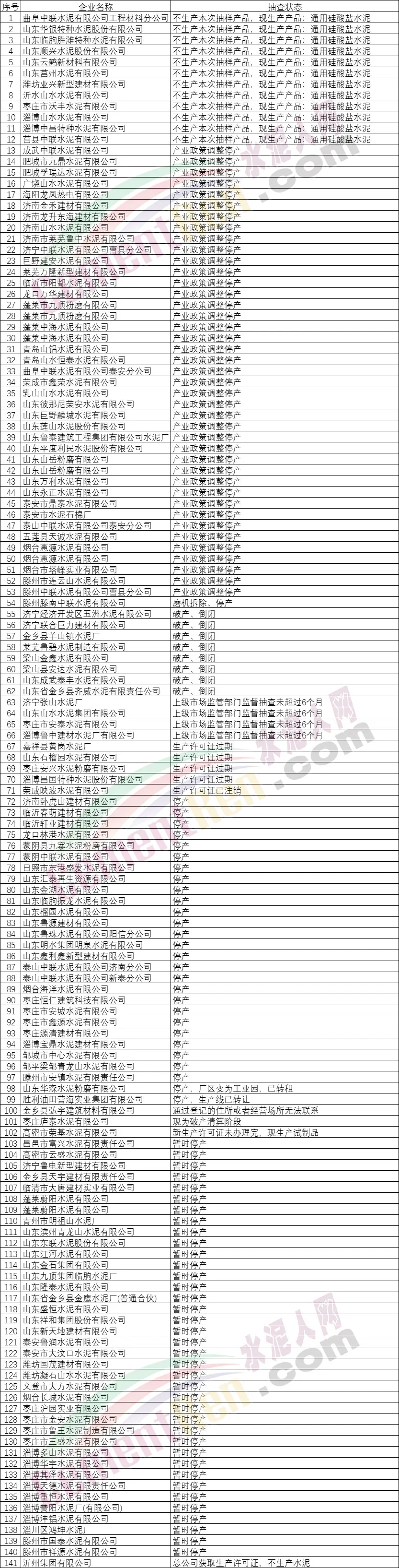 金鄉(xiāng)縣弘宇建筑材料有限公司,通過登記的住所或者經(jīng)營場所無法聯(lián)系;棗莊廬泰水泥有限公司,現(xiàn)為破產(chǎn)清算階段;高密市榮基水泥有限公司,新生產(chǎn)許可證未辦理完,現(xiàn)生產(chǎn)試制品。