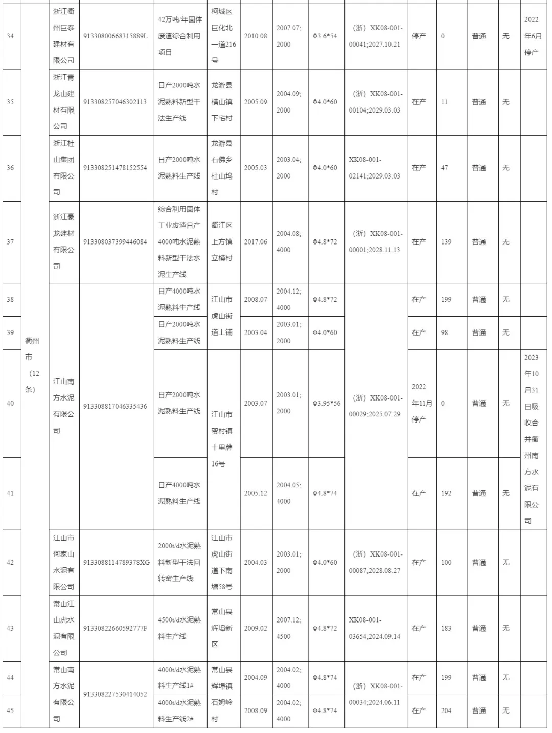 浙江省2023年度水泥熟料生產(chǎn)線清單