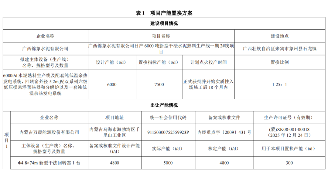 據了解,早在2022年7月11日,廣西壯族自治區(qū)工業(yè)和信息化廳發(fā)布關于廣西錦象水泥有限公司日產6000噸新型干法水泥熟料生產線一期2#線項目產能置換方案的公示,其中包括內蒙古萬晨能源股份有限公司產能出讓情況。