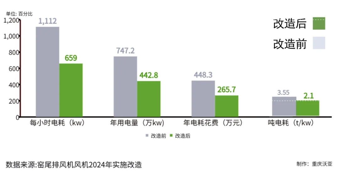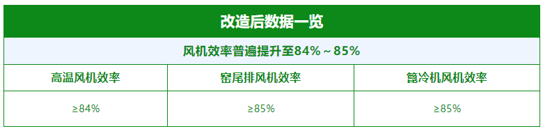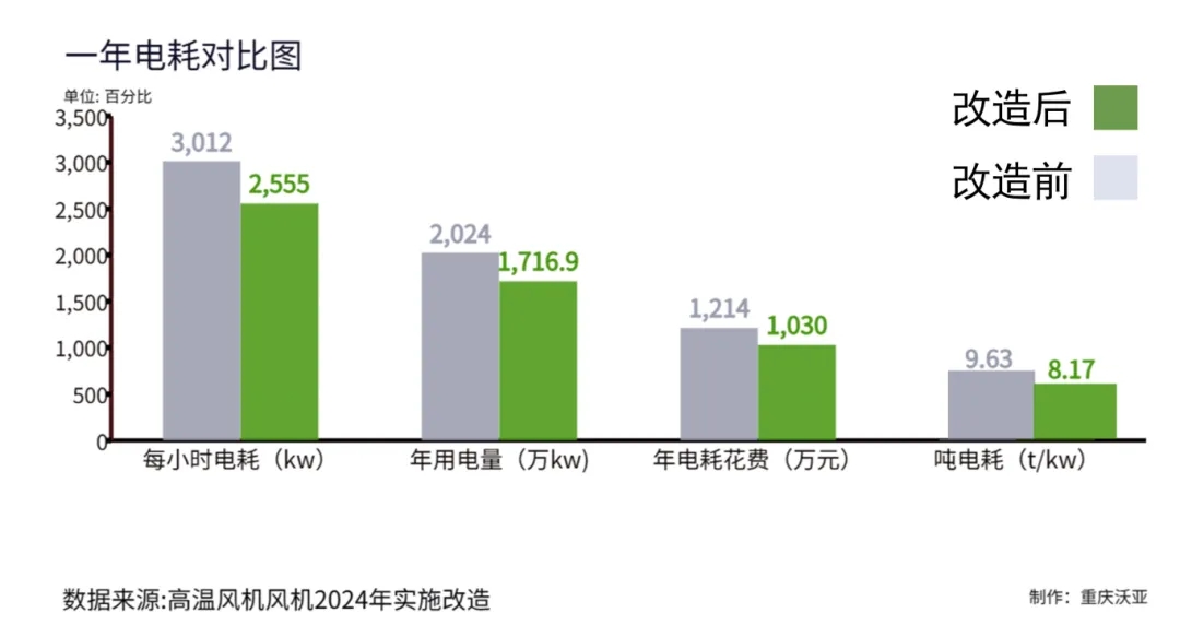 高溫風(fēng)機(jī)技改使用重慶沃亞高效風(fēng)機(jī)后電費(fèi)年收益約184萬元;減少二氧化碳排放2978.8噸;減少燃煤使用量1228.4噸;技改完成后風(fēng)機(jī)運(yùn)行效率提升35.3%。