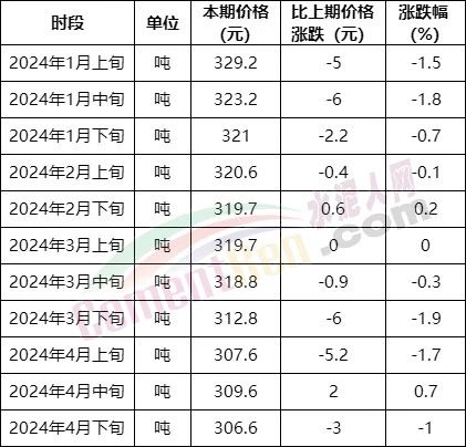 國(guó)家統(tǒng)計(jì)局2024年4月下旬流通領(lǐng)域普通硅酸鹽水泥(P.O42.5袋裝)均價(jià)為351.9元/噸,環(huán)比4月中旬降價(jià)5.5元/噸。普通硅酸鹽水泥(P.O42.5散裝)均價(jià)306.6元/噸,環(huán)比4月中旬下跌3元/噸。