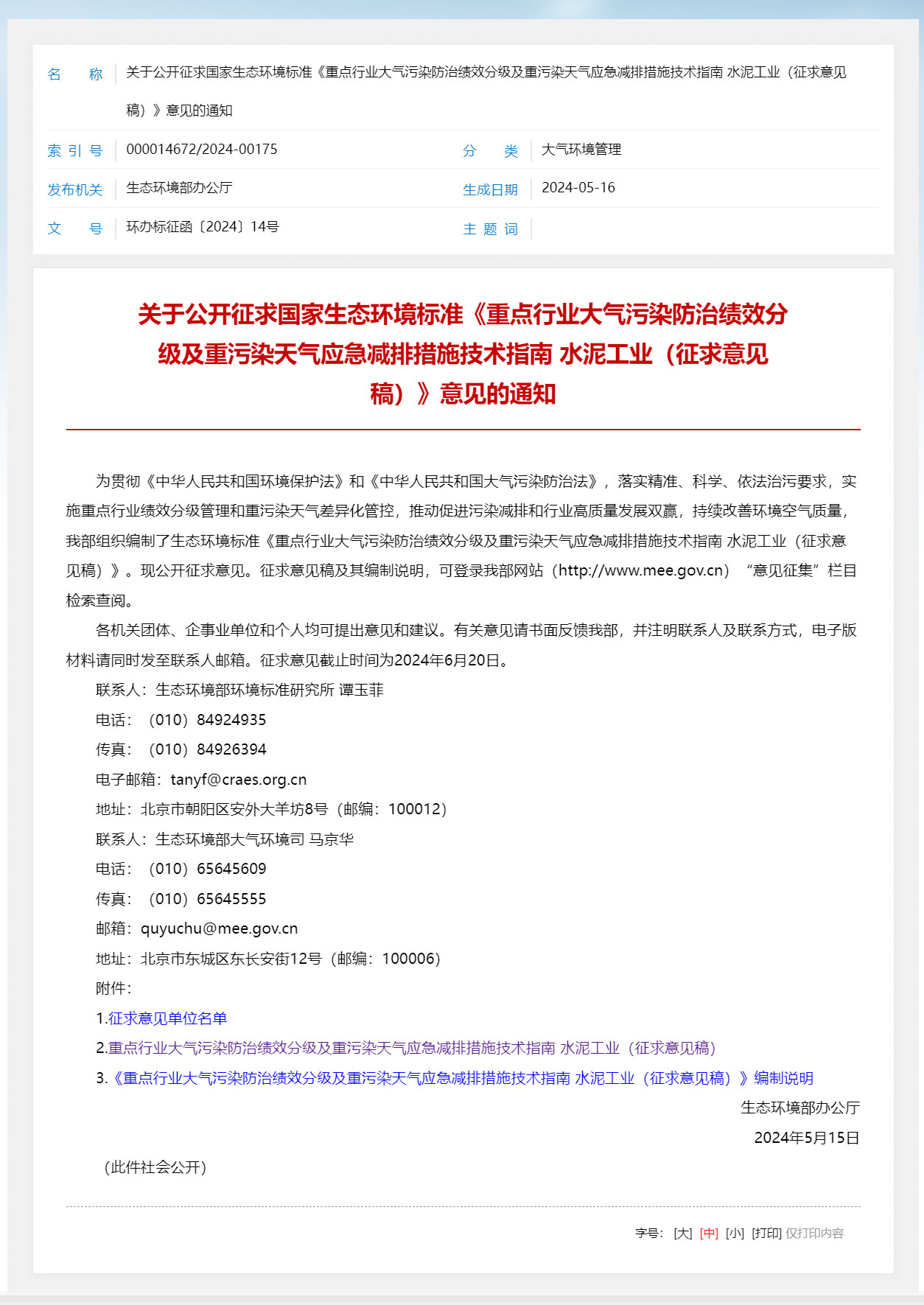 ?5月16日,生態(tài)環(huán)境部辦公廳發(fā)布關(guān)于公開征求國家生態(tài)環(huán)境標(biāo)準(zhǔn)《重點(diǎn)行業(yè)大氣污染防治績效分級及重污染天氣應(yīng)急減排措施技術(shù)指南 水泥工業(yè)(征求意見稿)》意見的通知稱,為貫徹《中華人民共和國環(huán)境保護(hù)法》和《中華人民共和國大氣污染防治法》,落實(shí)精準(zhǔn)、科學(xué)、依法治污要求,實(shí)施重點(diǎn)行業(yè)績效分級管理和重污染天氣差異化管控,推動促進(jìn)污染減排和行業(yè)高質(zhì)量發(fā)展雙贏,持續(xù)改善環(huán)境空氣質(zhì)量,我部組織編制了生態(tài)環(huán)境標(biāo)準(zhǔn)《重點(diǎn)行業(yè)大氣污染防治績效分級及重污染天氣應(yīng)急減排措施技術(shù)指南 水泥工業(yè)(征求意見稿)》?,F(xiàn)公開征求意見。征求意見稿及其編制說明,可登錄我部網(wǎng)站(http://www.mee.gov.cn)“意見征集”欄目檢索查閱。