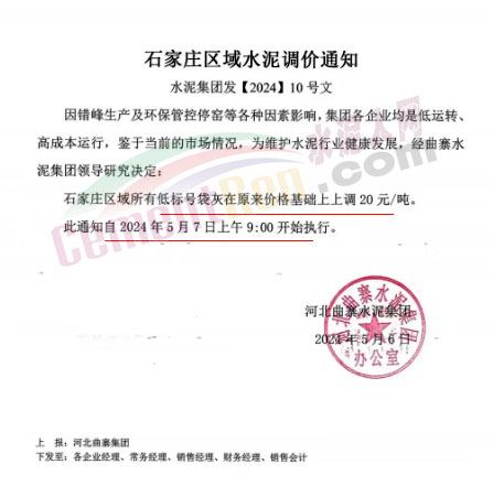日前河北石家莊地區(qū)主要品牌企業(yè)曲寨水泥通知,因錯峰生產(chǎn)及環(huán)保管控停窯等各種因素影響,集團各企業(yè)均是低運轉、高成本運行,鑒于當前的市場情況,為維護水泥行業(yè)健康發(fā)展,經(jīng)曲寨水泥集團領導研究決定,自2024年5月7日上午9:00開始石家莊區(qū)域所有低標號袋灰在原來價格基礎上上調20元/噸。