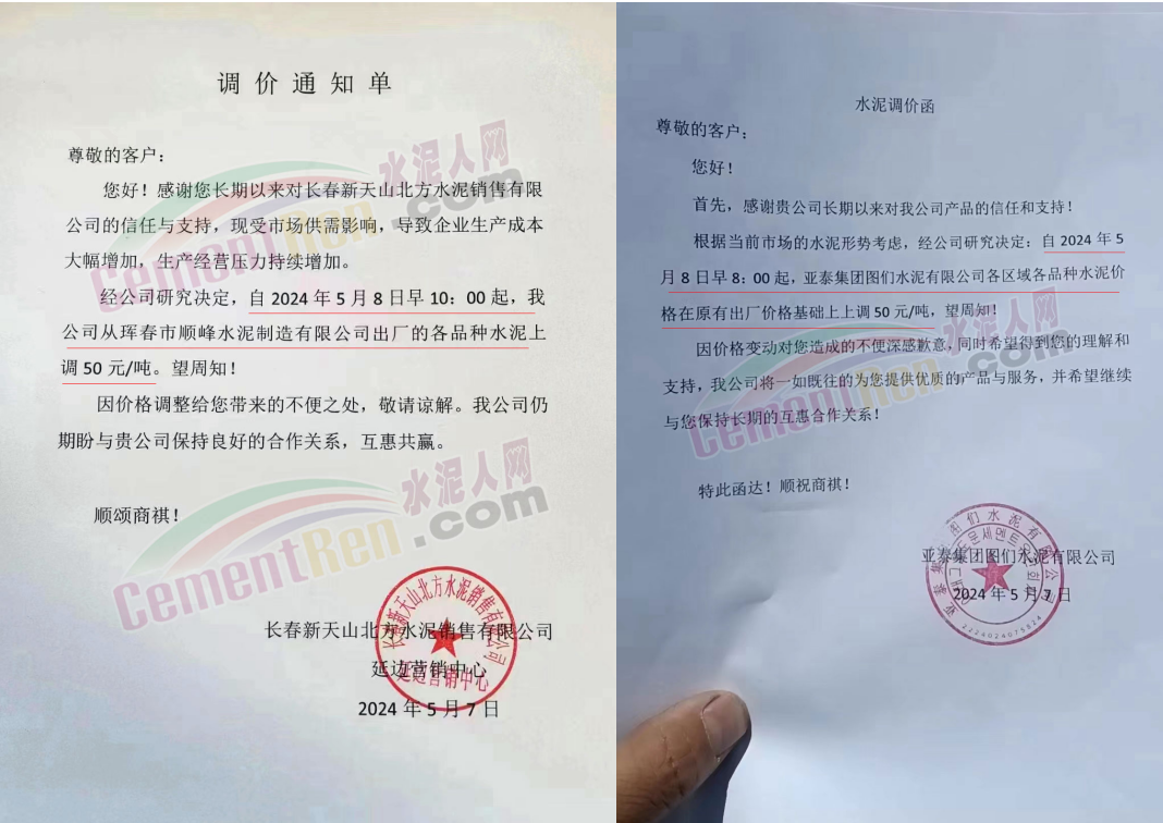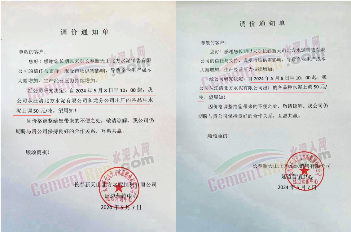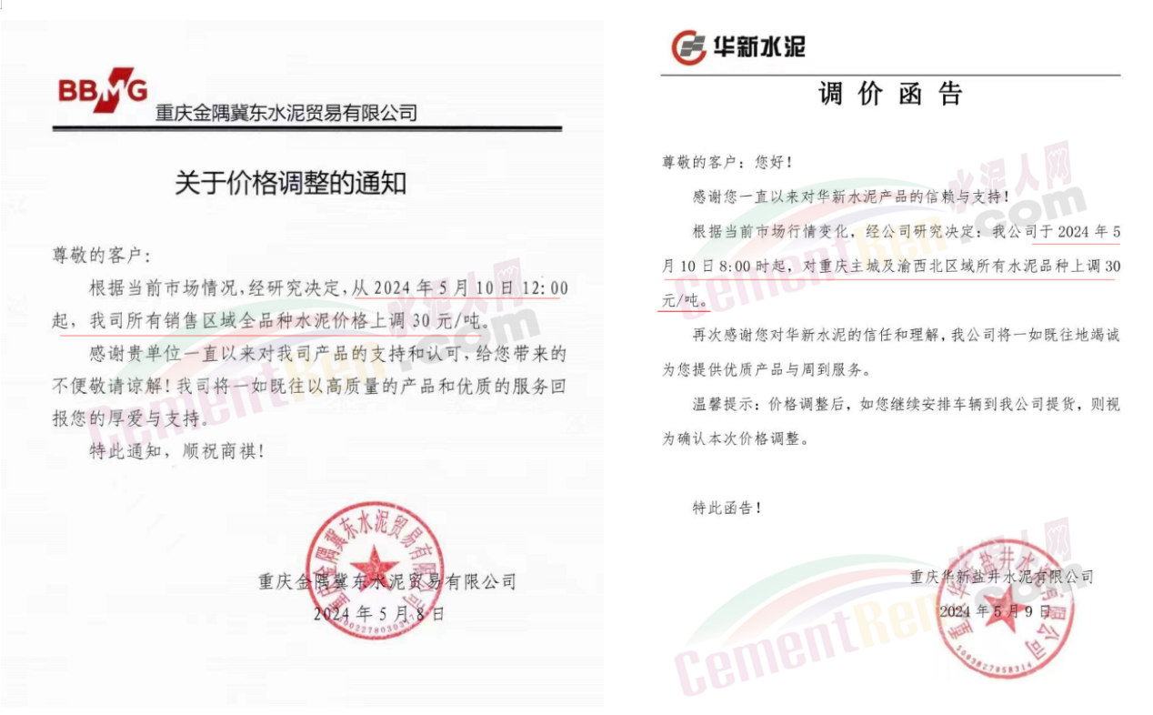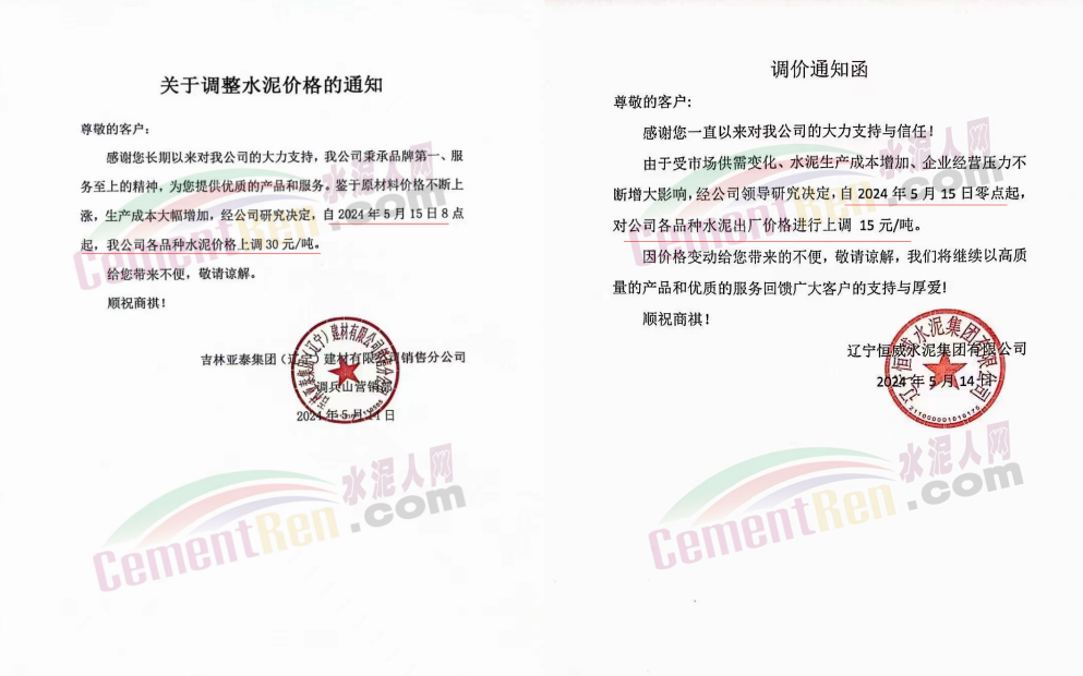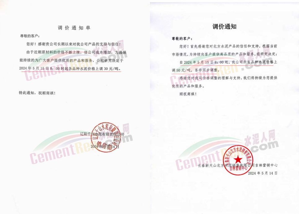 同期遼寧、吉林、黑龍江、河北、河南、重慶等多地水泥企業(yè)通知上調水泥價格30-50元/噸。
