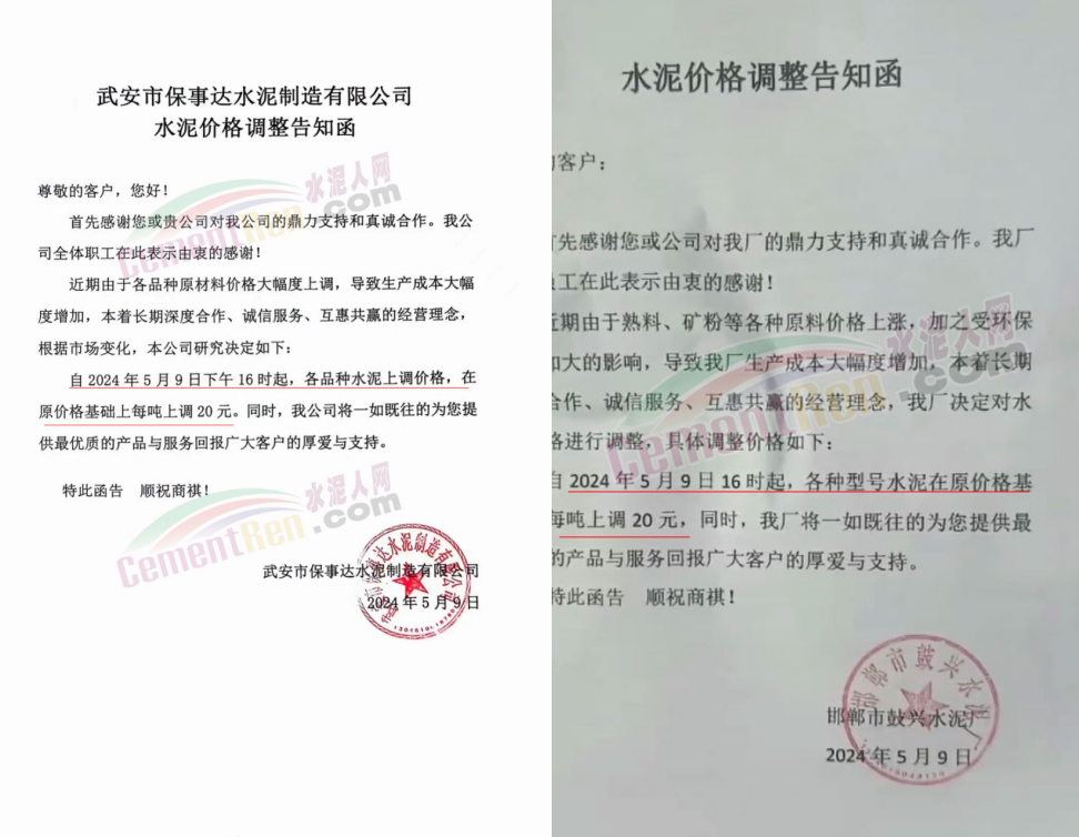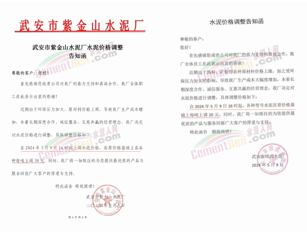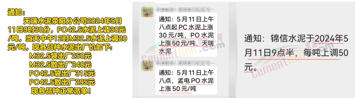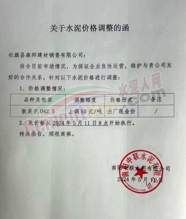 河南天瑞滎陽分公司通知,自5月11日9時30分起,P.O42.5水泥上調30元/噸,當天中午M32.5水泥上調20元/噸。價格調整后M32.5包裝水泥出廠價250元/噸,P.O42.5散裝水泥出廠價295元/噸。南陽中聯(lián)水泥通知5月11日起水泥價格上調50元/噸。