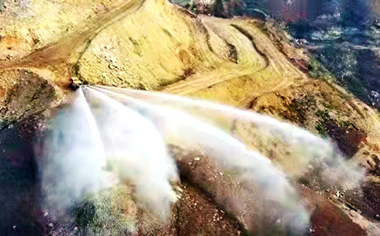 由于工程緊鄰南水北調(diào)工程干渠,水電八局領(lǐng)導(dǎo)非常重視項(xiàng)目建設(shè)過(guò)程中的環(huán)境保護(hù),尤其是在山體的開(kāi)挖過(guò)程中,需要采用爆破方式。但在爆破過(guò)程中,揚(yáng)塵的治理一直是行業(yè)內(nèi)的大難題。如果采用傳統(tǒng)的水袋壓塵,費(fèi)時(shí)費(fèi)力,效果非常有限,且在填裝炮孔過(guò)程中水袋容易劃破,導(dǎo)致內(nèi)部的水流出,進(jìn)而影響炮孔的爆破效果;若選用霧炮車(chē)壓塵,細(xì)微的水霧在巨大的“蘑菇云”面前根本招架不住。通過(guò)多次考察,水電八局決定采用交大神舟最先進(jìn)的“多功能礦山抑塵車(chē)”。