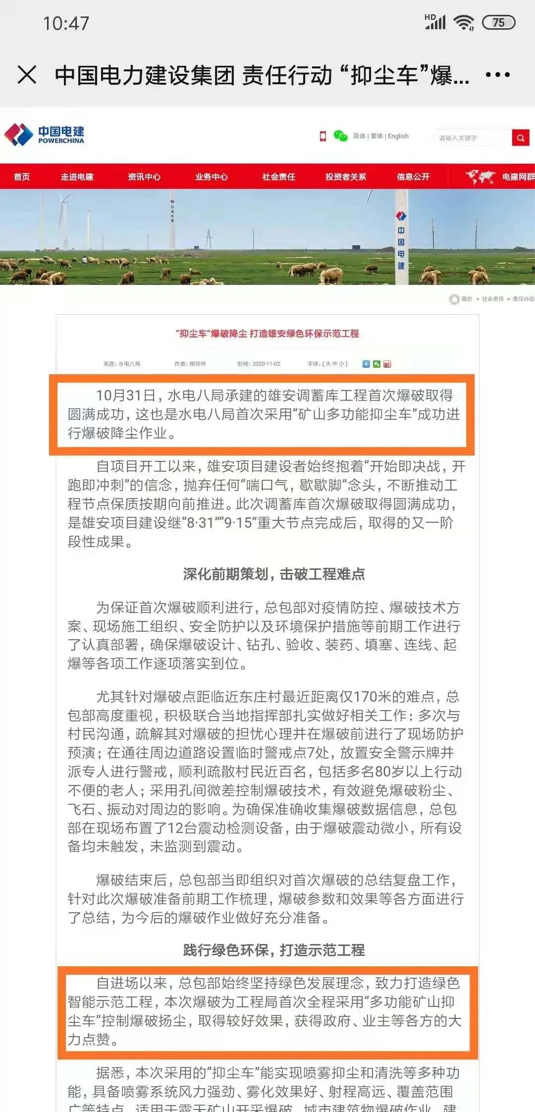 中國(guó)電建對(duì)本次爆破行動(dòng)的報(bào)道,對(duì)交大神舟多功能抑塵車(chē)給予了非常高的評(píng)價(jià)。