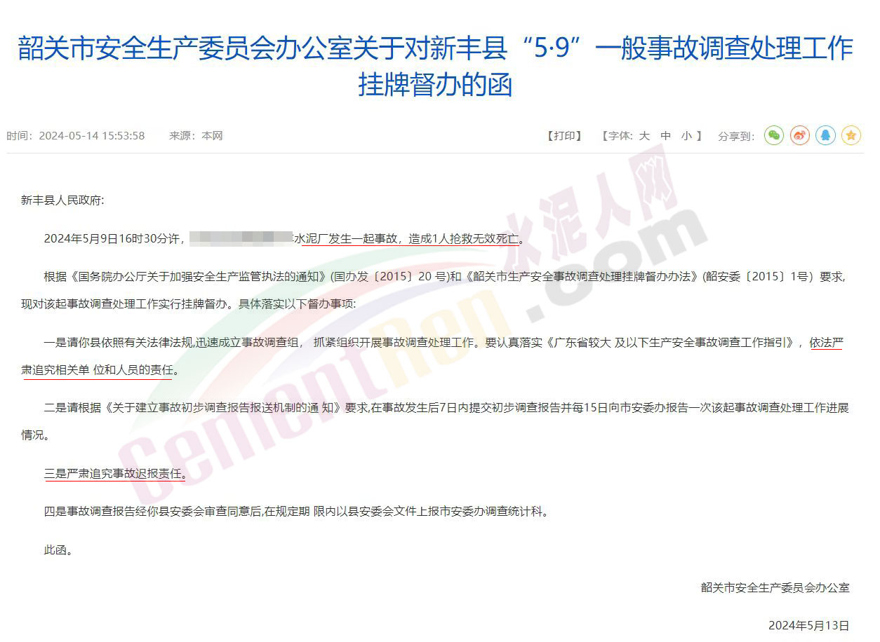 今年5月13日,韶關(guān)市安全生產(chǎn)委員會辦公室發(fā)布《關(guān)于對新豐縣“5.9”一般事故調(diào)查處理工作掛牌督辦的函》提到2024年5月9日16時30分許,韶關(guān)市某水泥廠內(nèi)發(fā)生一起事故,造成1人搶救無效死亡。根據(jù)相關(guān)文件要求,韶關(guān)市對該起事故調(diào)查處理工作實行掛牌督辦。并要求嚴(yán)肅追究相關(guān)單位和人員的責(zé)任和事故遲報責(zé)任。