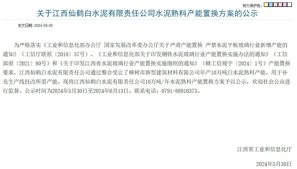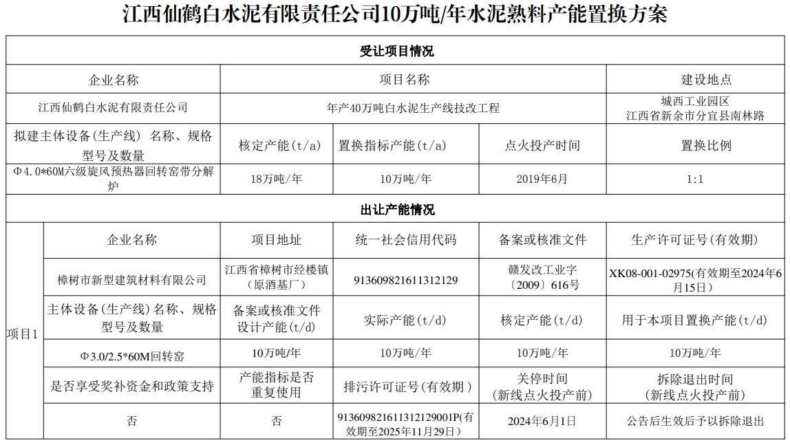 公示附件《江西仙鶴白水泥有限責(zé)任公司10萬噸/年水泥熟料產(chǎn)能置換方案》顯示,受讓項(xiàng)目江西仙鶴白水泥有限責(zé)任公司年產(chǎn)40萬噸白水泥生產(chǎn)線技改工程,建設(shè)地點(diǎn)位于城西工業(yè)園區(qū)江西省新余市分宜縣南林路。