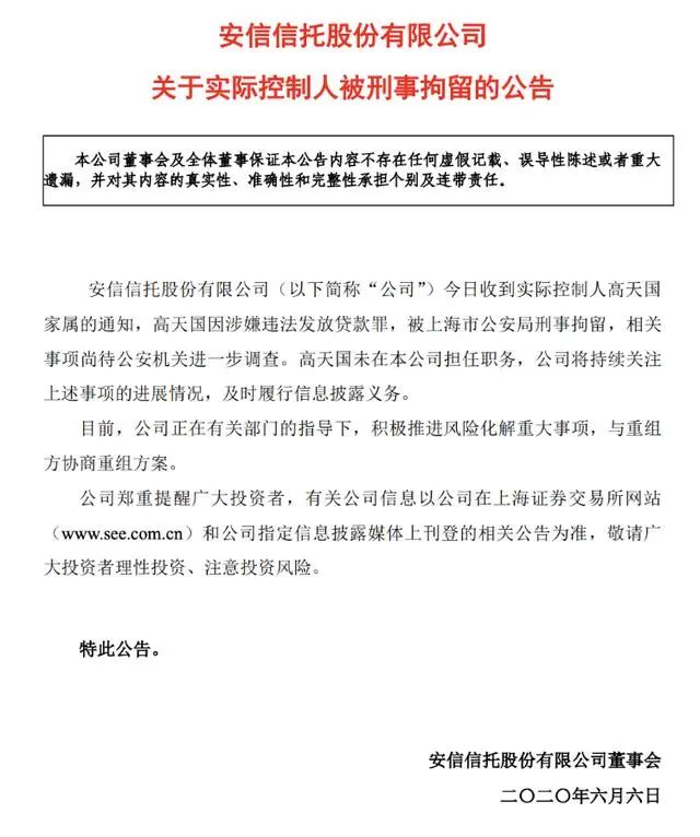 2019年,安信信托多個(gè)項(xiàng)目“爆雷”無(wú)法兌付,并被法院列入被執(zhí)行人,訴訟纏身。2020年6月,安信信托公告稱,收到實(shí)際控制人高天國(guó)家屬的通知,高天國(guó)因涉嫌違法發(fā)放貸款罪,被上海市公安局刑事拘留,這也成為三至喜來(lái)登酒店走向拍賣的開(kāi)端。