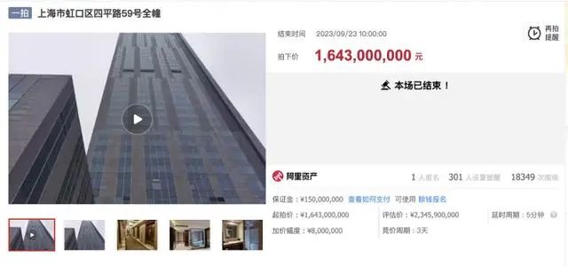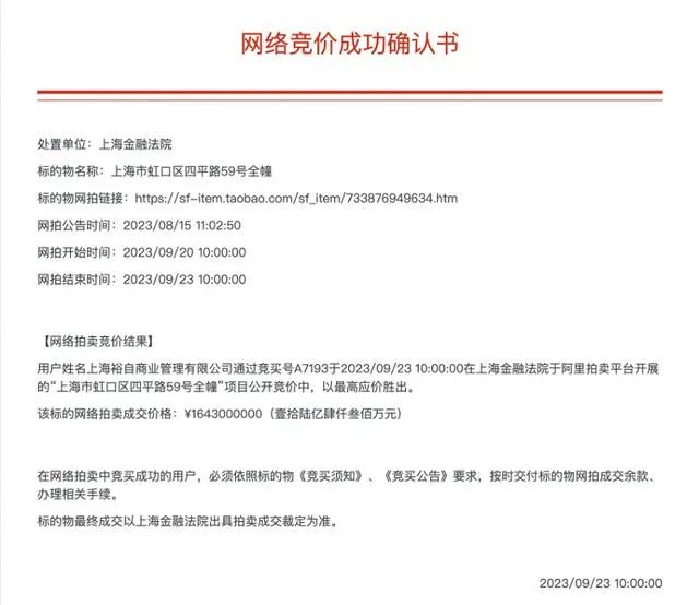 上海金融法院執(zhí)行立案后,于2023年9月23日公開(kāi)拍賣被執(zhí)行人抵押的全幢酒店即涉案酒店。阿里資產(chǎn)拍賣平臺(tái)顯示,此次拍賣共有18349人圍觀,1人報(bào)名。最終酒店以16.43億元的成交價(jià)被上海裕自商業(yè)管理有限公司拍下。