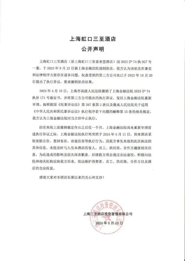 三至酒店微信公眾號(hào)顯示,2024年1月,公眾號(hào)名稱由“上海虹口三至喜來(lái)登酒店”認(rèn)證為“上海虹口三至酒店”。5月17日,三至酒店發(fā)布聲明稱,認(rèn)為拍賣在事實(shí)法律程序方面存在諸多問(wèn)題,權(quán)益受損的第三方公司也提出了執(zhí)行異議,要求撤銷拍賣結(jié)果。