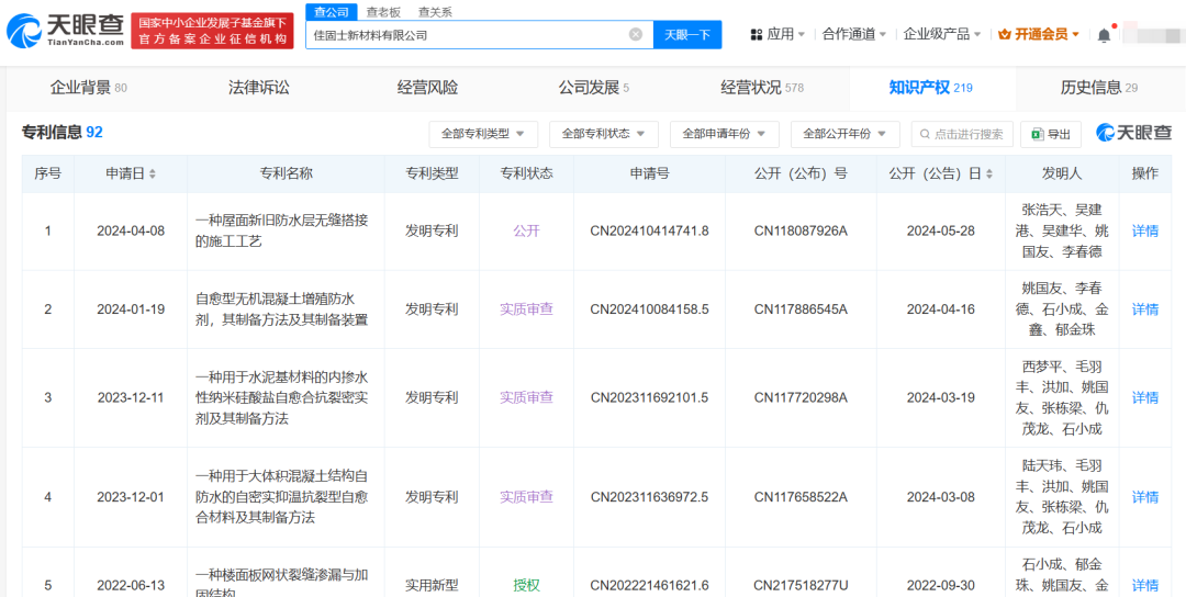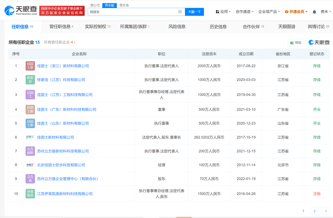 公開信息顯示,姚國友畢業(yè)后創(chuàng)業(yè)成立公司,產(chǎn)品已應(yīng)用到了2022年國家冬奧會主場館這樣的國家重點(diǎn)工程。天眼查App顯示,姚國友共關(guān)聯(lián)15家企業(yè),其中9家為存續(xù)狀態(tài),包括佳固士新材料有限公司、修家佳(江蘇)科技有限公司、蘇州立方盾新材料科技有限公司、北京佳固士防水科技有限公司等,姚國友在上述企業(yè)中多擔(dān)任法定代表人、董事長、執(zhí)行董事等。值得一提的是,佳固士新材料有限公司已申請近百項(xiàng)專利,其中近60項(xiàng)為有效狀態(tài),包括“一種混凝土裂縫自愈外加劑及其制備方法”“一種建筑墻面長效除堿抗?jié)B結(jié)構(gòu)”“建筑變形縫的防水補(bǔ)縫結(jié)構(gòu)”等,其發(fā)明人中均包括姚國友。