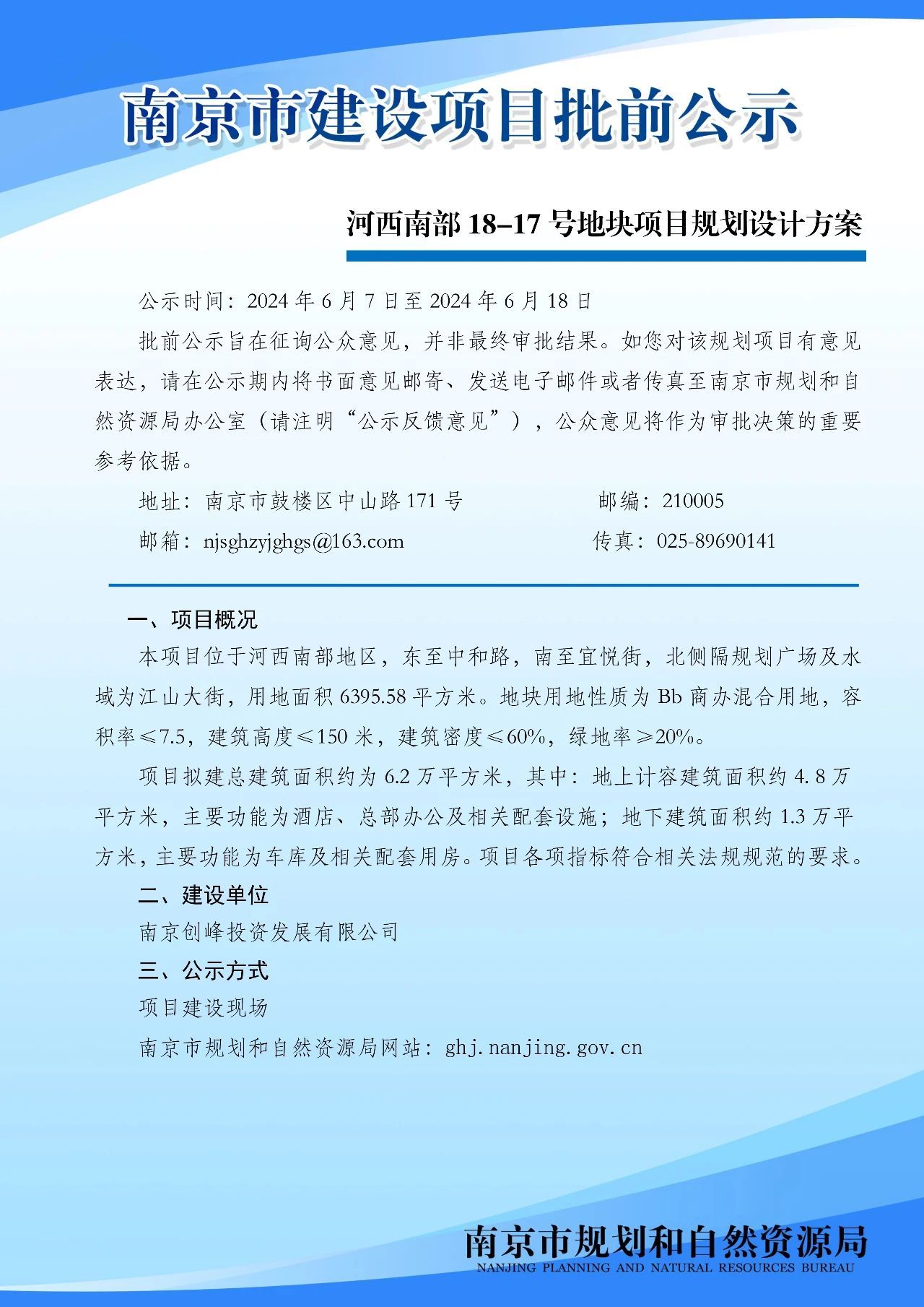 據(jù)南京市規(guī)劃和自然資源局,南京河西南部18-17號地塊項目規(guī)劃設計方案進行批前公示,河西南又一總部大樓江蘇金峰水泥總部項目將拔地而起,高度不超過150米,和阿里巴巴江蘇總部、小米華東總部做鄰居。