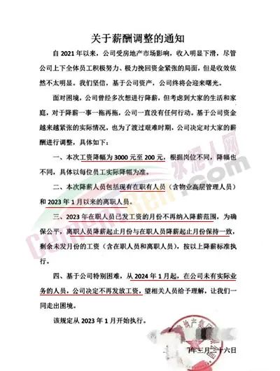 該房企通知稱,基于公司資金越來越緊張的實際情況,也為了度過艱難時期,公司決定對大家的薪酬進行調(diào)整。本次工資降幅為200元~3000元,降薪人員包括現(xiàn)有在職人員和2023年1月以來的離職人員。離職人員降薪起止月份與在職人員降薪起止月份保持一致,剩余未發(fā)月份的工資按降薪標(biāo)準(zhǔn)執(zhí)行。從2024年1月起,在公司未有實際業(yè)務(wù)的人員,公司決定不再發(fā)放工資。