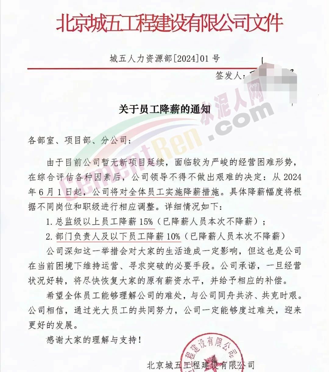 北京一家大型建筑企業(yè)公開發(fā)布通知稱,從2024年6月1日起,公司將對全體員工實施降薪措施。其中總監(jiān)級以上員工降薪15%,部門負責(zé)人及以下員工降薪10%。