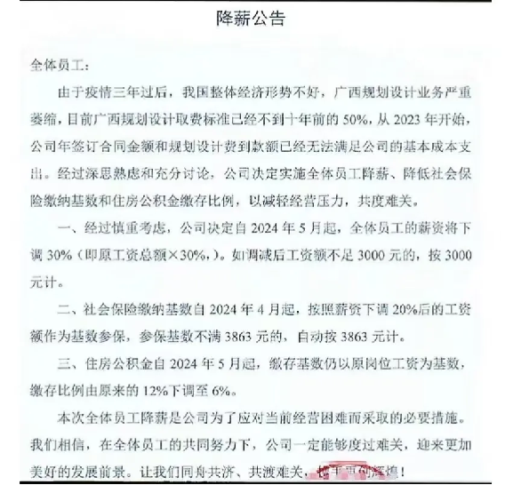 廣西某設(shè)計院發(fā)布降薪公告給全體員工稱,目前廣西規(guī)劃設(shè)計取費標(biāo)準(zhǔn)已經(jīng)不到十年前的50%,從2023年開始,公司年簽訂合同金額和規(guī)劃設(shè)計費到款額已經(jīng)無法滿足公司的基本成本支出。經(jīng)過深思熟慮和充分討論,公司決定實施全體員工降薪、降低社會保險繳納基數(shù)和住房公積金繳存比例,以減輕經(jīng)營壓力,共渡難關(guān)。