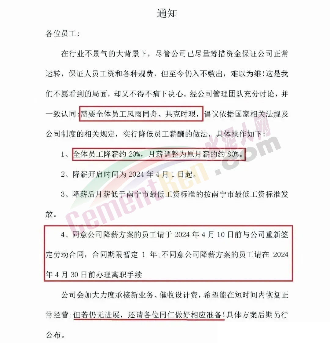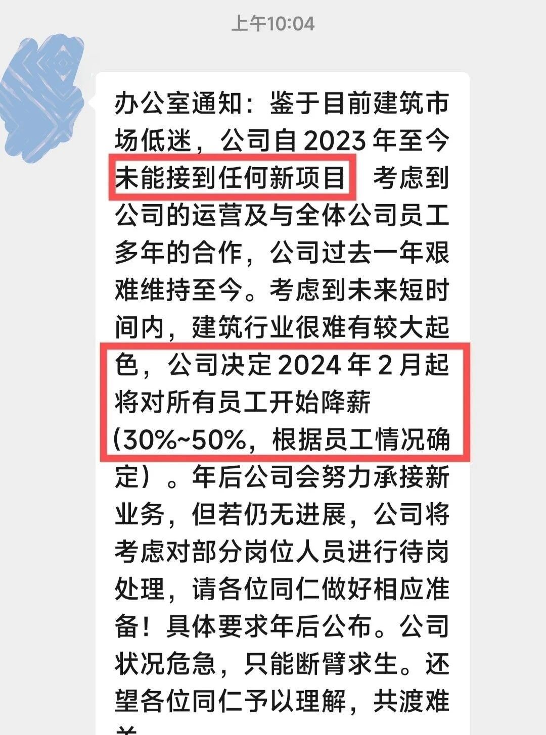 某施工企業(yè)通知稱,鑒于目前建筑市場低迷,公司自2023年至今未能接到任何新項目??紤]到未來短時間內(nèi),建筑行業(yè)很難有較大起色,公司決定2024年2月起將對所有員工開始降薪30%~50%。