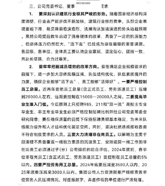 某中字頭央企工程局領(lǐng)導(dǎo)喊話,要求全局干部員工深刻認(rèn)識當(dāng)下建筑行業(yè)極其嚴(yán)峻的形勢,為了“活下去”,要牢牢把握減員增效的改革方向。
