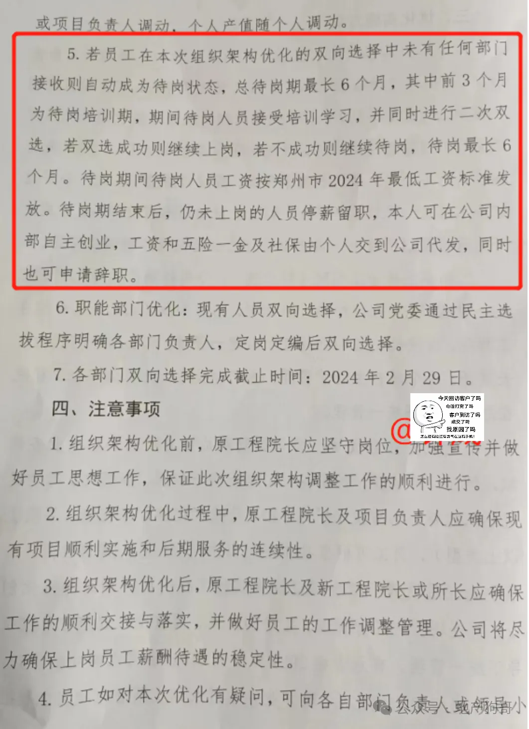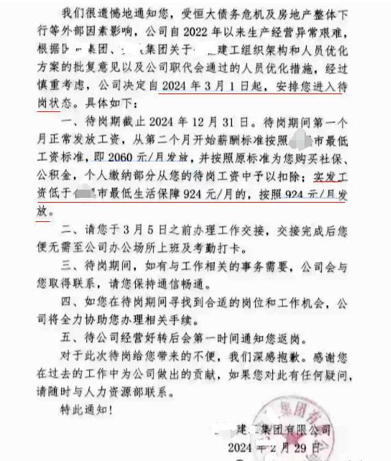 某市建工集團人員優(yōu)化通知稱,受恒大債務(wù)危機及房地產(chǎn)整體下行等外部因素影響,公司自2022年以來生產(chǎn)異常困難,決定自2024年3月1日起,安排進入待崗狀態(tài)。3月5日前辦理工作交接,后續(xù)無需再上班。