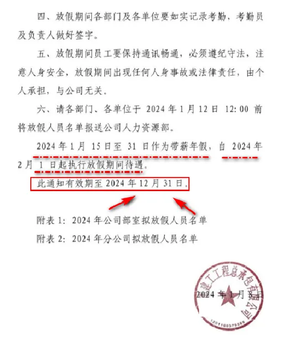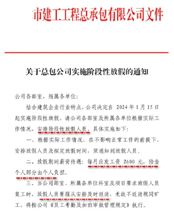 某建工工程總承包公司通知稱,2024年1月15日公司開始陸續(xù)放假,一直到2024年12月31日。從2月1日到12月31日開始放假,待崗人員每月發(fā)放2600元基本工資,社保個人部分自己負擔(dān)。