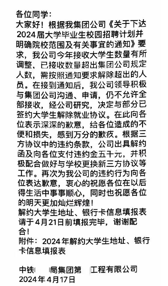 某中鐵工程企業(yè)發(fā)通知稱,今年接受大學(xué)生數(shù)據(jù)有所調(diào)整,已接收數(shù)據(jù)超出集團公司規(guī)定人數(shù),將與部分已簽約學(xué)生解除就業(yè)協(xié)議。