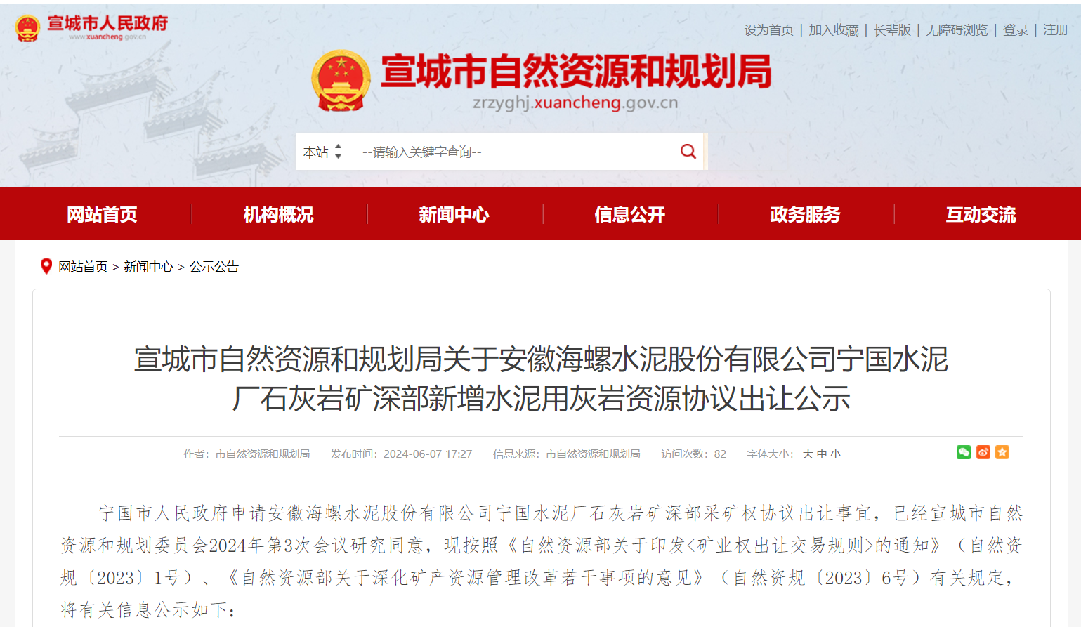 6月7日,安徽省宣城市自然資源和規(guī)劃局發(fā)布安徽海螺水泥股份有限公司寧國水泥廠石灰?guī)r礦深部新增水泥用灰?guī)r資源協(xié)議出讓公示。