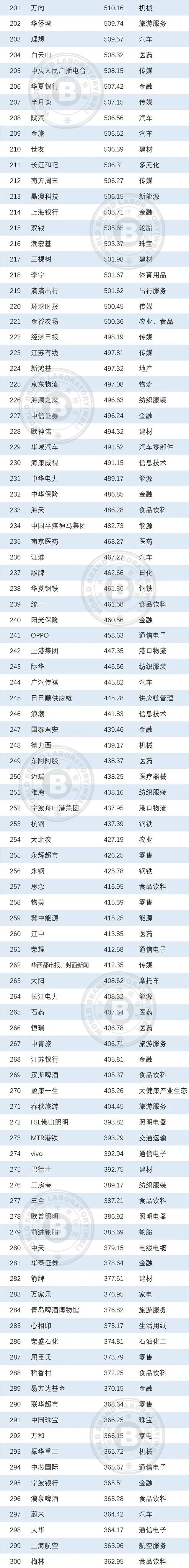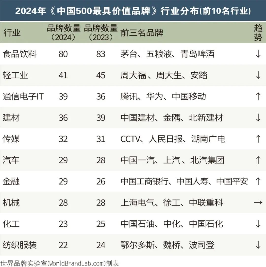 本年度《中國(guó)500最具價(jià)值品牌》排行榜中,共有來(lái)自食品飲料、輕工業(yè)、建材、傳媒、紡織服裝、醫(yī)藥、機(jī)械等在內(nèi)的24個(gè)相關(guān)行業(yè)的品牌入選。其中食品飲料業(yè)依然是入選品牌最多的行業(yè),共有80個(gè)品牌入選,占總?cè)脒x品牌數(shù)的16.00%;入選數(shù)量位居第二到第五的行業(yè)分別是輕工(41個(gè))、通信電子IT(39個(gè))、建材(36個(gè))、傳媒(32個(gè))。在衡量品牌的忠誠(chéng)度時(shí),世界品牌實(shí)驗(yàn)室參考了我信品牌(iTrust Rating)的評(píng)級(jí)數(shù)據(jù);在衡量品牌的領(lǐng)導(dǎo)力特別是ESG(環(huán)境、社會(huì)和治理)評(píng)分時(shí),參考了超級(jí)財(cái)經(jīng)(SuperFinance)的ESG數(shù)據(jù)庫(kù)。同時(shí)還借用了低碳國(guó)際(Carboncare International)對(duì)品牌企業(yè)碳排放的計(jì)量,以推動(dòng)品牌添加“碳排放評(píng)分”標(biāo)簽。