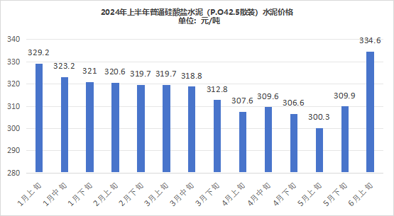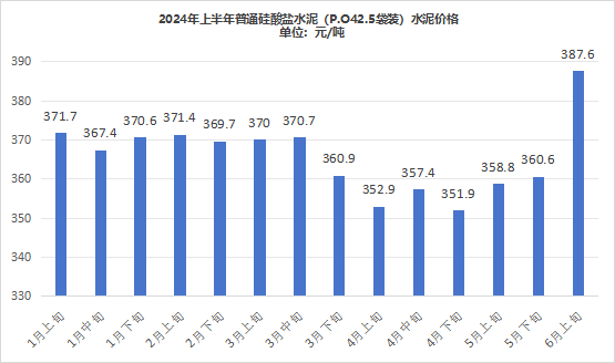 從上半年全國(guó)P.O42.5袋、散裝水泥價(jià)格的變化情況來看,1~3月底,全國(guó)水泥價(jià)格維持在370元/噸左右,3月中旬至5月上旬,全國(guó)水泥價(jià)格出現(xiàn)下滑,下滑幅度在20元/噸左右。