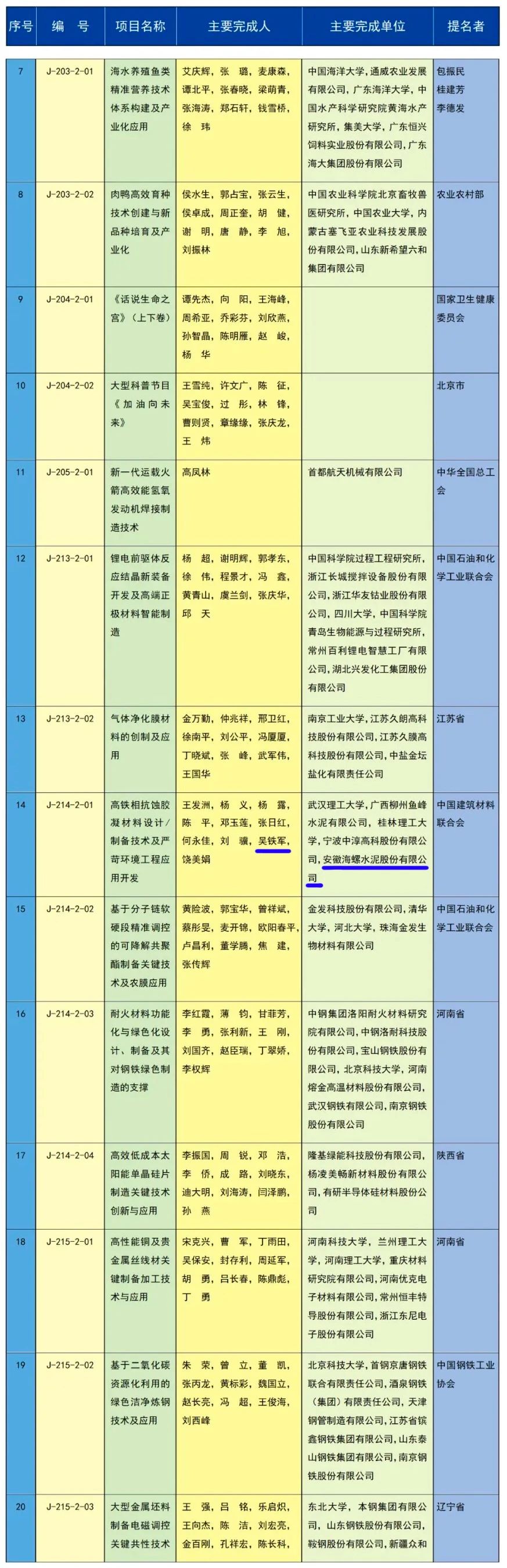 2023年度國家科技進(jìn)步獎(jiǎng)項(xiàng)目評選中,由中國建筑材料聯(lián)合會提名的《高鐵相抗蝕膠凝材料設(shè)計(jì)/制備技術(shù)及嚴(yán)苛環(huán)境工程應(yīng)用開發(fā)》獲得二等獎(jiǎng),該項(xiàng)目完成單位分別有武漢理工大學(xué)、廣西柳州魚峰水泥有限公司、桂林理工大學(xué)、寧波中淳高科股份有限公司,以及安徽海螺水泥股份有限公司,其中,在主要完成人名單中,安徽海螺水泥股份有限公司副總經(jīng)理吳鐵軍位列其中。