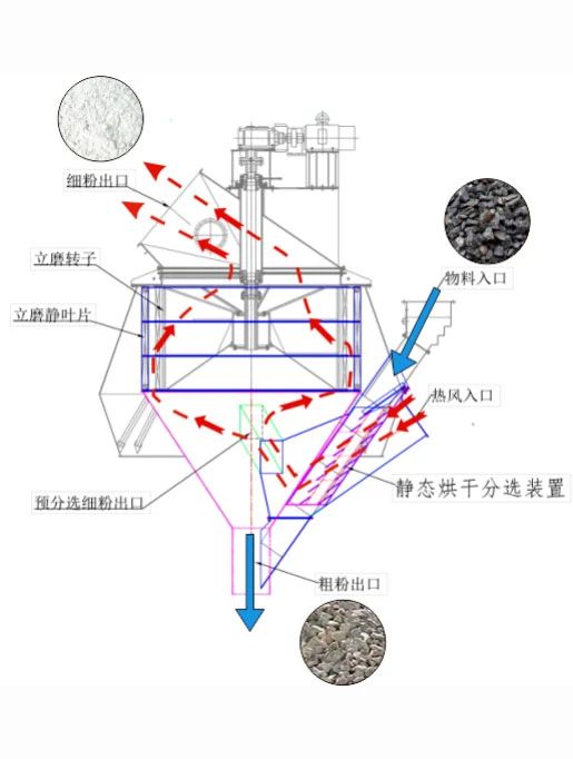 傳統(tǒng)立磨系統(tǒng)中,被粉磨物料都是通過中心喂料或邊沿喂料的方式,物料直接送到旋轉(zhuǎn)的磨盤上。物料在離心力作用下向磨盤邊緣移動的過程中,經(jīng)磨輥碾壓粉磨后,被甩到磨盤周圍的噴嘴環(huán)上,噴嘴環(huán)內(nèi)高速噴出的熱風(fēng)將物料烘干、打散和分選,粗顆粒物料落回磨盤被再次粉磨,細(xì)粉隨風(fēng)進(jìn)入立磨選粉機(jī)二次分選,合格細(xì)粉進(jìn)入轉(zhuǎn)子,作為成品收集入庫,不合格細(xì)粉落回磨盤,進(jìn)入下一個粉磨、烘干、打散、分選的循環(huán)。