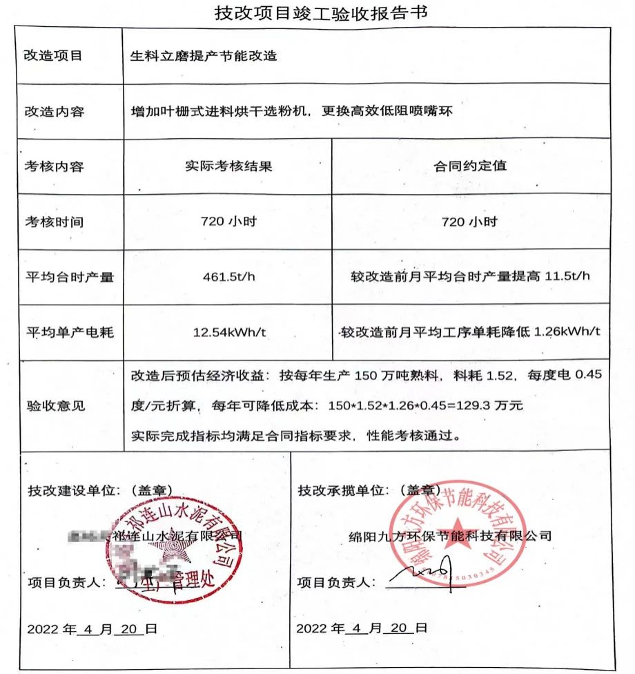 經(jīng)過改造后按每年生產(chǎn)150萬噸熟料,料耗1.52,每度電0.45度/元計算,每年可降低成本:150*1.52*1.26*0.45=129.3萬元。