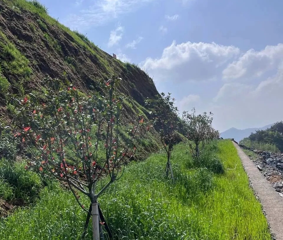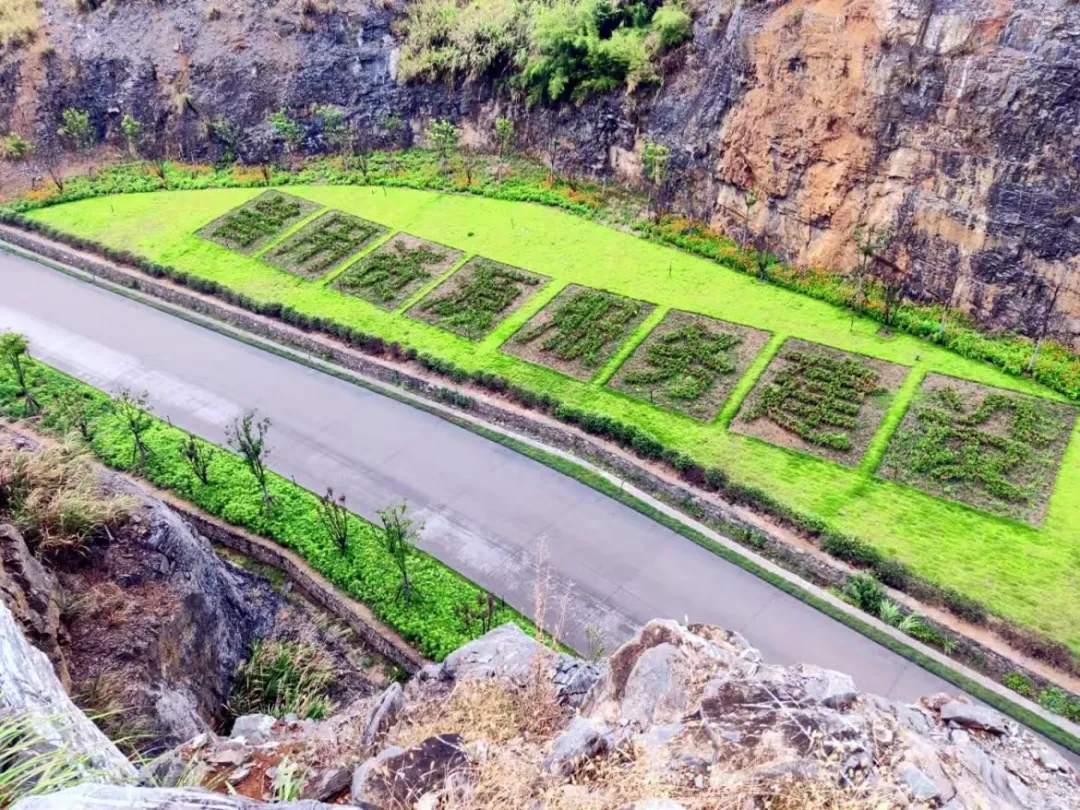 江山分公司秉持邊開采邊治理原則,在最終邊坡處修筑塊石擋墻,擋墻內(nèi)覆土并人工播撒草灌,種植紅葉石楠,邊坡坡面采用掛網(wǎng)噴漿的方式噴撒草籽。修筑蓄水池連接礦山水泵房,坡面上架設(shè)噴淋管道,方便后期養(yǎng)護(hù)用水,邊坡外圍修建臺階及防護(hù)欄與上層平臺相連。將系統(tǒng)觀念貫穿生態(tài)文明建設(shè)全過程,注重科學(xué)運(yùn)用和實(shí)踐深化,堅持綜合治理、系統(tǒng)治理、源頭治理。