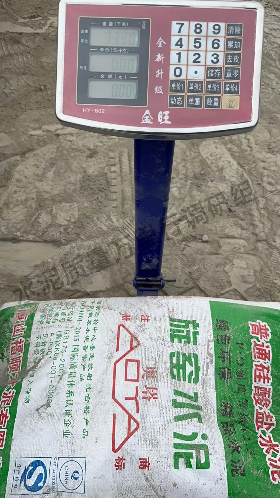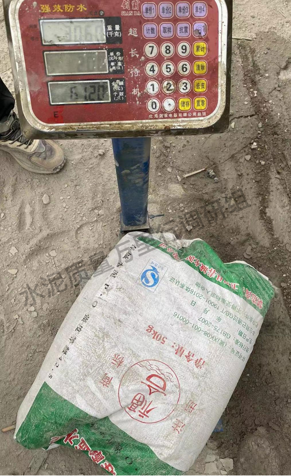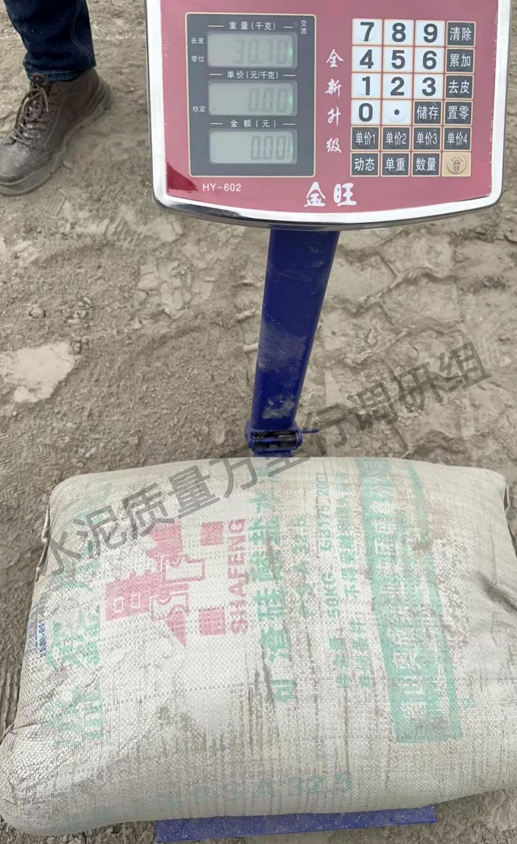 標(biāo)稱生產(chǎn)企業(yè)唐山奧成水泥廠的“盛鑫”牌PSA32.5(50kg)水泥,實(shí)際稱重為30.7kg。