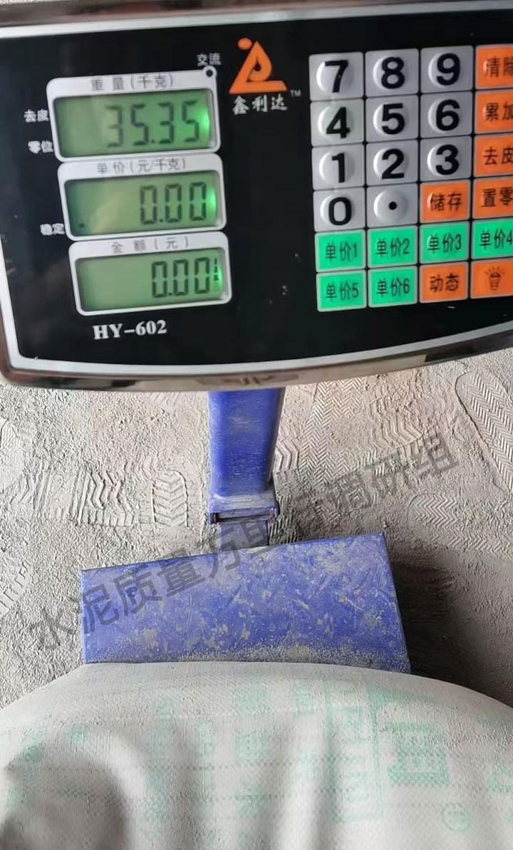 標(biāo)稱生產(chǎn)企業(yè)為唐山冀龍水泥的“喬潤(rùn)”牌PSA32.5(50kg)產(chǎn)品,實(shí)際稱重為35.35kg。