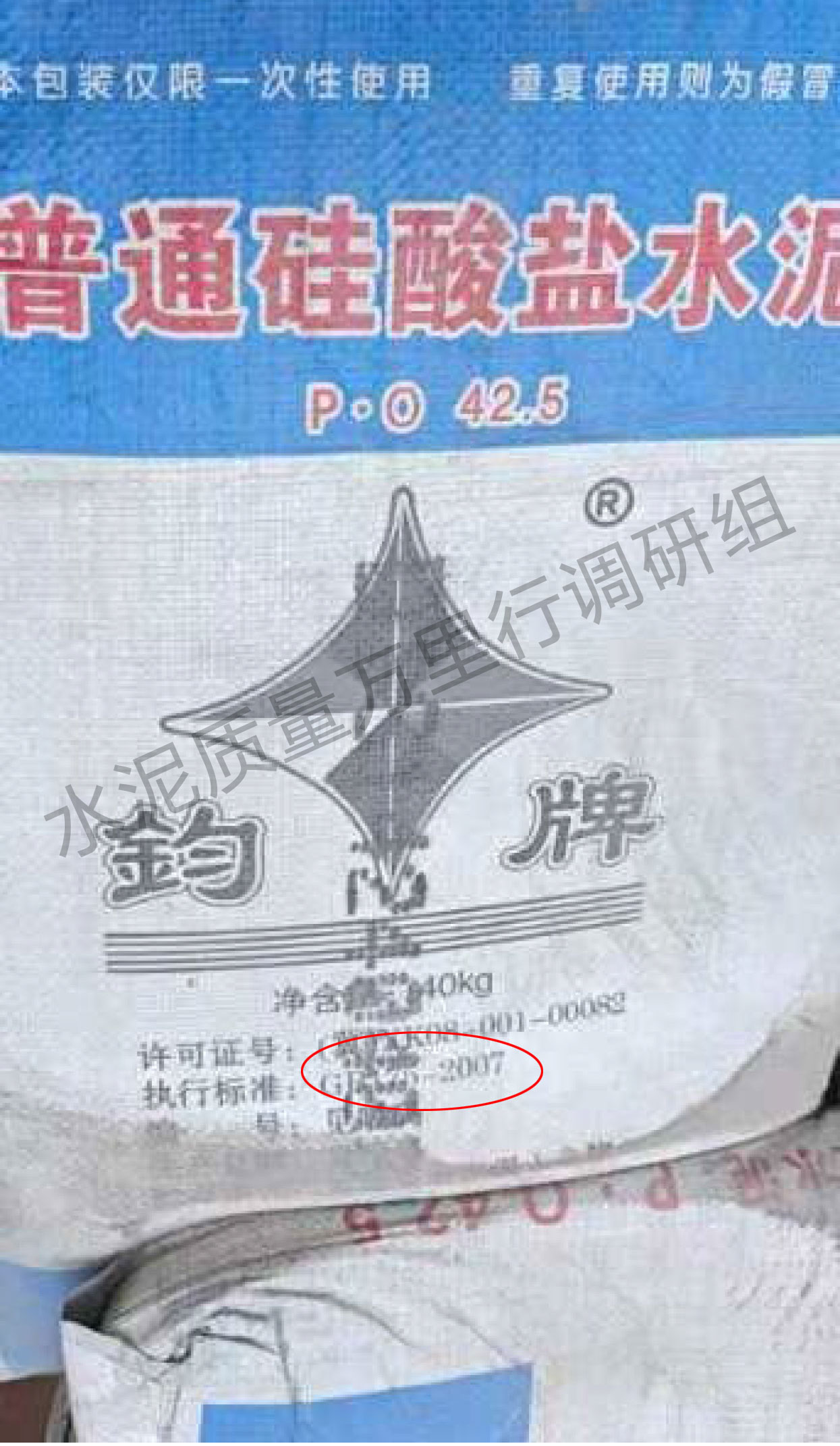 上面這些尚有據(jù)可查,還有部分“三無(wú)產(chǎn)品”——無(wú)生產(chǎn)日期、無(wú)生產(chǎn)廠家、無(wú)生產(chǎn)許可證號(hào)或生產(chǎn)許可證號(hào)和標(biāo)稱廠家查無(wú)此廠的情況。此類產(chǎn)品分布在北京市多個(gè)區(qū)縣,日銷量百余噸。此外,還有包裝袋印刷相關(guān)信息錯(cuò)亂情況,屢見(jiàn)不鮮,如:標(biāo)稱為“鈞牌”P.O42.5水泥的執(zhí)行標(biāo)準(zhǔn)引用過(guò)期水泥標(biāo)準(zhǔn)GB175-2007。