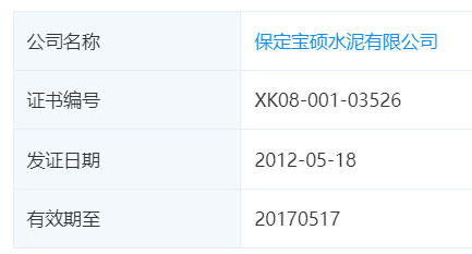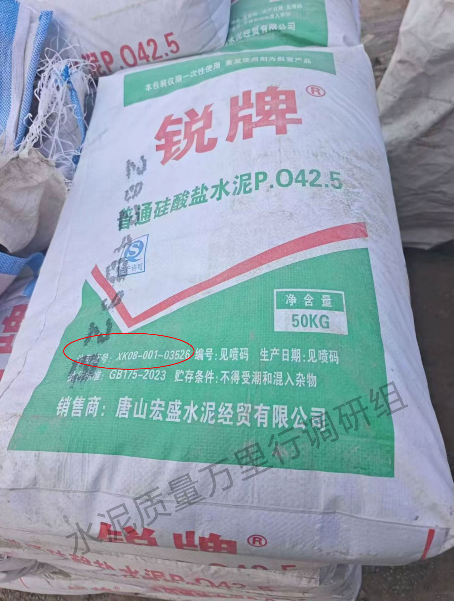 標(biāo)稱銷售商為唐山宏盛水泥經(jīng)貿(mào)有限公司的“銳”牌P.O42.5水泥,許可證編號(hào):XK08-001-03526。據(jù)查詢,該許可證企業(yè)主體為保定寶碩水泥有限公司,發(fā)證日期2012年5月18日,有效期至2017年5月17日。在該批次產(chǎn)品包裝上未見(jiàn)標(biāo)稱生產(chǎn)企業(yè)名稱。
