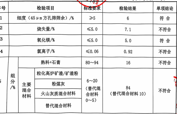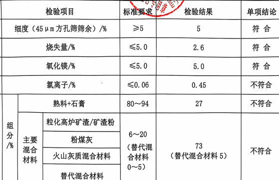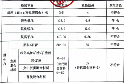 標稱生產(chǎn)企業(yè)為唐山潤德水泥有限公司的“碩磊”牌P.O42.5水泥,檢驗結(jié)果顯示氯離子含量0.45%,是標準限值的7.5倍。組分項目檢驗結(jié)果也與標準要求不符合,熟料+石膏實測只有27%,主要混合材為73%。