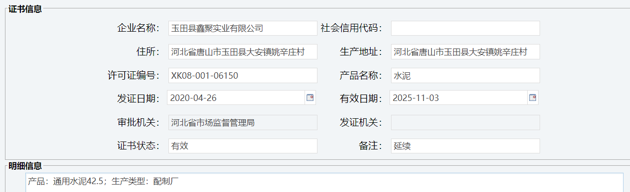 據(jù)查詢,玉田縣鑫聚實業(yè)有限公司生產(chǎn)地址位于河北省唐山市玉田縣大安鎮(zhèn)姚辛莊村。生產(chǎn)許可證編號XK08-001-06150有效期至2025年11月3日,許可產(chǎn)品為通用水泥42.5;生產(chǎn)類型為配制廠。“玉夢”牌為玉田縣鑫聚實業(yè)有限公司自有注冊商標,目前在北京市場主要流向門頭溝區(qū)。
