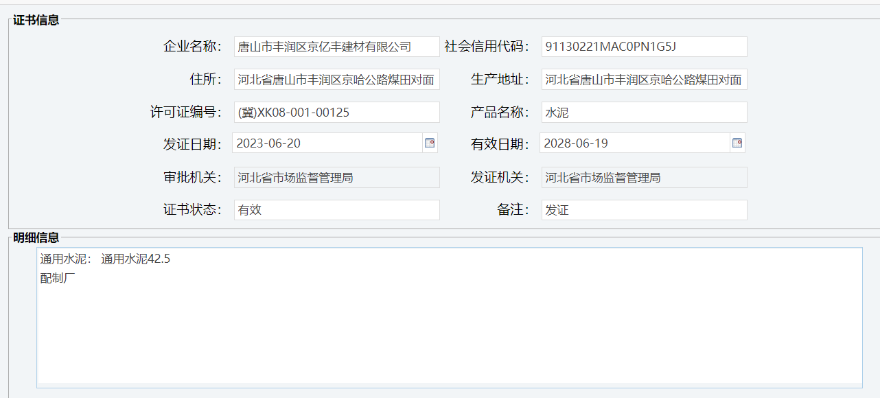 據(jù)查詢,該企業(yè)生產(chǎn)地址位于河北省唐山市豐潤區(qū)京哈公路煤田對面,生產(chǎn)許可證編號(冀)XK08-001-00125有效期至2028年6月19日。許可產(chǎn)品為通用水泥42.5,企業(yè)類型為配制廠。目前在北京市場主要流向豐臺、房山、門頭溝、朝陽區(qū)等多個建材市場。