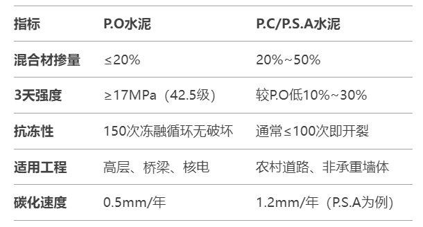 從執(zhí)行標(biāo)準(zhǔn)的角度來說,P.O(普通硅酸鹽水泥)、P.S.A(礦渣硅酸鹽水泥A型)和P.C(復(fù)合硅酸鹽水泥)在成分、性能及適用范圍上存在顯著差異。
