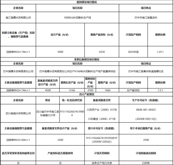 變更方案顯示:原擬建的南江海螺水泥有限公司5000t/d水泥熟料生產(chǎn)線項目變更為巴中海螺水泥有限責(zé)任公司日產(chǎn)6166噸水泥熟料生產(chǎn)線產(chǎn)能置換項目,置換比例由原來的1.25:1變?yōu)?.5:1。