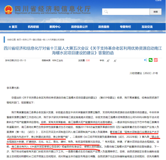 而在2022年5月13日,四川省經(jīng)濟和信息化廳發(fā)布【四川省經(jīng)濟和信息化廳對省十三屆人大第五次會議《關(guān)于支持革命老區(qū)利用優(yōu)勢資源啟動南江海螺水泥項目建設(shè)的建議》答復(fù)的函】稱:受有關(guān)政策影響,南江海螺水泥產(chǎn)能置換項目無法落地建設(shè)。
