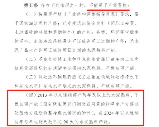 現(xiàn)行置換辦法第二章第五條規(guī)定:2013年以來連續(xù)停產(chǎn)兩年及以上的水泥熟料、平板玻璃產(chǎn)能(因省級主管部門制定或同意的錯峰生產(chǎn)方案以及因地方規(guī)劃調(diào)整導(dǎo)致此情況的除外),或2024年以來連續(xù)兩年每年運轉(zhuǎn)天數(shù)不足90天的水泥熟料產(chǎn)能。不能用于產(chǎn)能置換。
