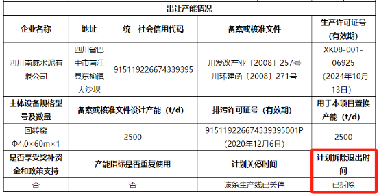 本次置換方案中,出讓方四川南威水泥有限公司生產(chǎn)許可證有效期至2024年10月13日,排污許可證有效期至2020年12月6日,截至本次變更方案公示,四川南威水泥有限公司生產(chǎn)許可證已過期5個月,排污許可證過期已超過4年。