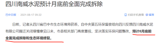 根據(jù)四川省生態(tài)環(huán)境保護督察工作領(lǐng)導(dǎo)小組辦公室2021年3月11日發(fā)布的關(guān)于【《四川省落實中央第五環(huán)境保護督察組督察反饋意見整改方案》第七十六項整改任務(wù)完成整改銷號的公告】顯示,截至2021年3月10日,南威水泥已按時完成現(xiàn)有生產(chǎn)線關(guān)閉,達到環(huán)境保護整改銷號要求。